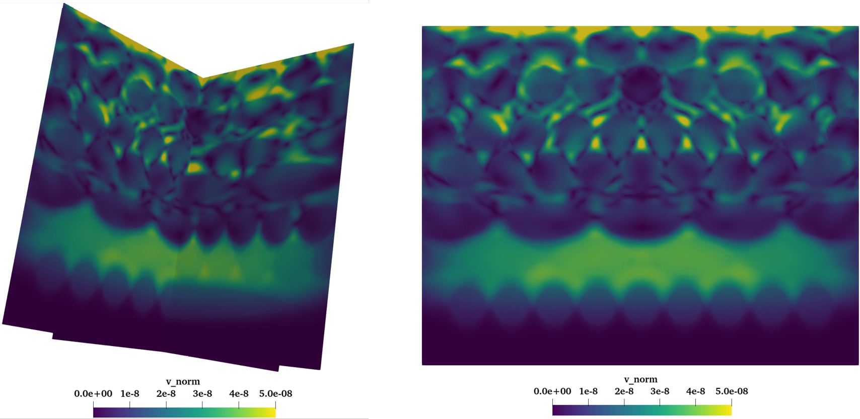 Отличительной особенностью используемого учеными метода является интеграция химерных сеток в единую фоновую сетку. В этом случае фоновая сетка имеет разрывы упругих параметров на интерфейсах между различными материалами. Химерные сетки, размещенные по обе стороны от этих разрывов, служат для представления отдельных структур с высоким уровнем детализации в пределах их границ. Упругие параметры в узлах наложенных химерных сеток устанавливаются в соответствии с базовыми параметрами фоновых узлов. Такой подход позволяет находить решения независимо в каждой отдельной вычислительной сетке для следующего временного шага.