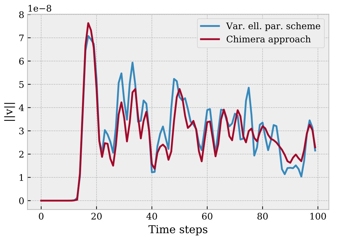 Процесс решения разворачивается на каждой сетке независимо, предоставляя результаты на следующем временном шаге. После этого значения переменных в узлах фоновой сетки уточняются посредством интерполяции из наложенных химерных сеток. Такой подход устраняет необходимость в более сложных методах для учета разрывов в фоновой сетке, оптимизируя вычислительный процесс.