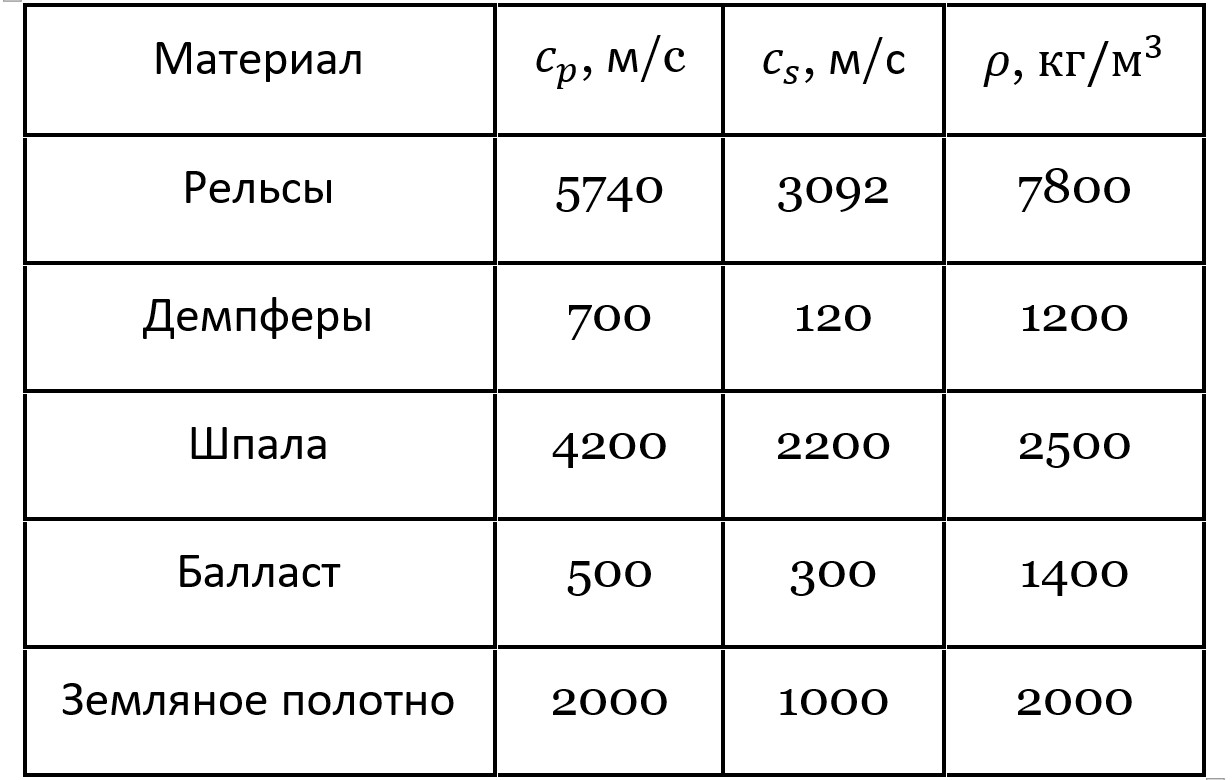 Рисунок 2. Параметры моделей сплошных упругих сред: скорость распространения продольных волн, скорость распространения поперечных волн, плотность. Таблица является русским переводом таблицы из статьи в Lobachevskii Journal of Mathematics.