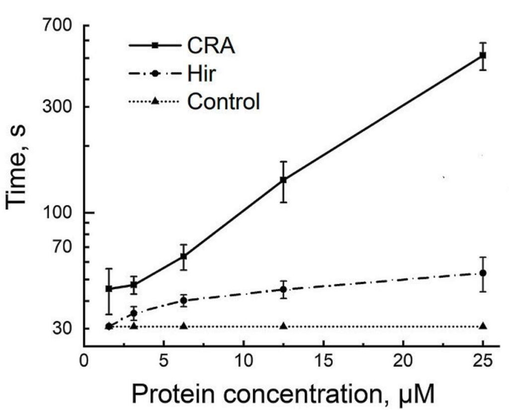 Антикоагулянтные свойства открытого белка исследовали с помощью стандартных анализов, которые выполняют в клинических лабораториях для оценки свертываемость крови по ряду показателей, включая активированное частичное тромбопластиновое время (АЧТВ), протромбиновое время (ПВ) и тромбиновое время (ТВ). Как следует из названий, все три величины показывают продолжительность протекания различных реакций в организме, приводящих к превращению крови из жидкости в плотный сгусток — тромб. Для сравнения, аналогичные эксперименты были выполнены с гирудином и контрольным образцом, то есть с плазмой крови без добавления антикоагулянтов.