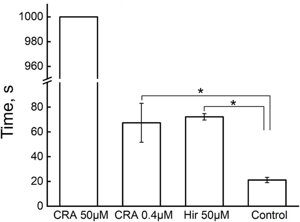Опыты показали, что присутствие в плазме крови цистеин-богатого антикоагулянта медицинской пиявки значительно увеличивает активированное частичное тромбопластиновое время (АЧТВ): в 10 раз при концентрации 20 µМ по сравнению с контрольным образцом и в 2—7 раз при сопоставлении с пробой, содержащей то же количество гирудина (Рисунок 1).