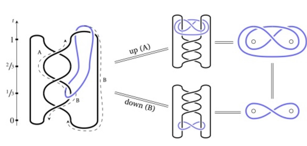 Рисунок 3. Сокращение узла двумя способами — сплющивая боковое кольцо вверх и вниз. Для пропуска нижней половины кольцевого звена через пересечения узловых диаграмм здесь применили правила плетения. Источник: журнал Physics Letters B.