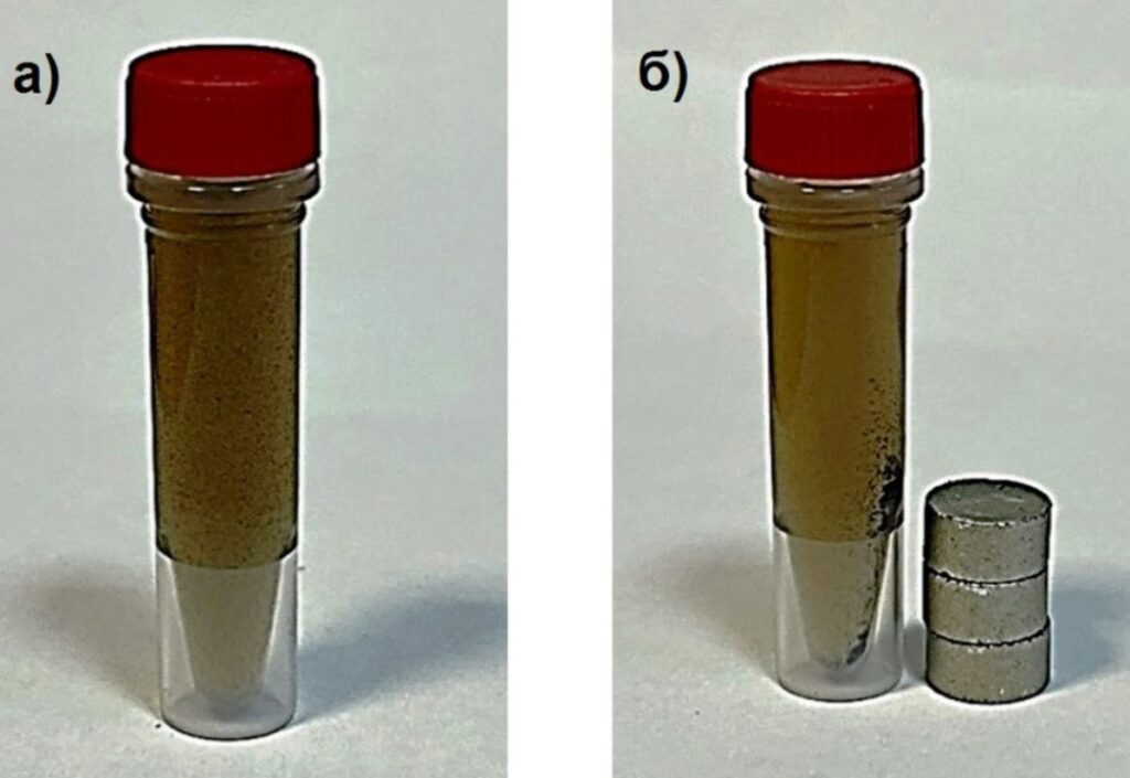 В результате ученые получили серо-бурую взвесь наночастиц в воде (Рисунок 1а). Затем к пробирке со взвесью они поднесли постоянные магниты. Частицы кобальта притягивались к магнитам и сосредотачивались у внутренней стенки пробирки (Рисунок 1б). Используя вибрационный магнитометр, ученые определили, что при комнатной температуре намагниченность насыщения и остаточная намагниченность составляет 10,4 ± 1,0 и – 3,6 ± 0,3 А ∙ м2 / кг соответственно.
