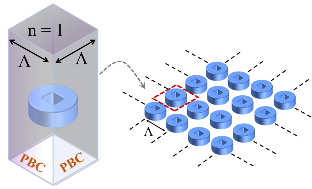 Рисунок 1. 2D метаповерхность (бесконечный массив), помещенная в воздух (n = 1) . Схематичное изображение мета-атома. Геометрические параметры: диаметр D = 360 нм, высота H = 90 нм, параметры щели: a = 100 нм, b = 135 нм и h = 50 нм. (изображение слева). Схематичное изображение 2D поверхности. (изображение справа). Источник: журнал Laser and Photonics Reviews