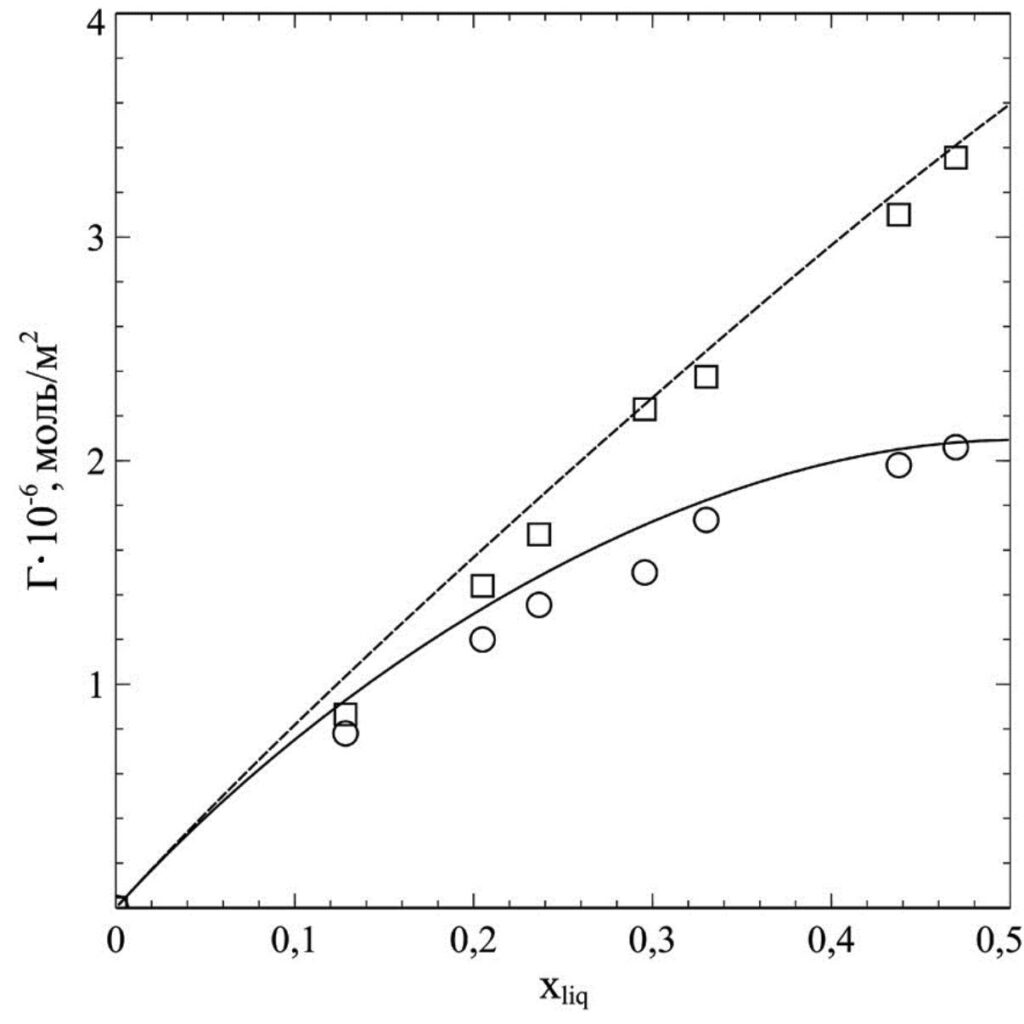 Рисунок 1. Зависимость адсорбции метана Г (моль/м2) на границе раздела фаз метан–этан от доли метана в жидкости Xliq при минус 60 °C. Сплошная линия (круги) — изотерма адсорбции Гиббса, пунктирная (квадраты) — смоделирована методом молекулярной динамики. Источник: Russian Journal of Physical Chemistry A.