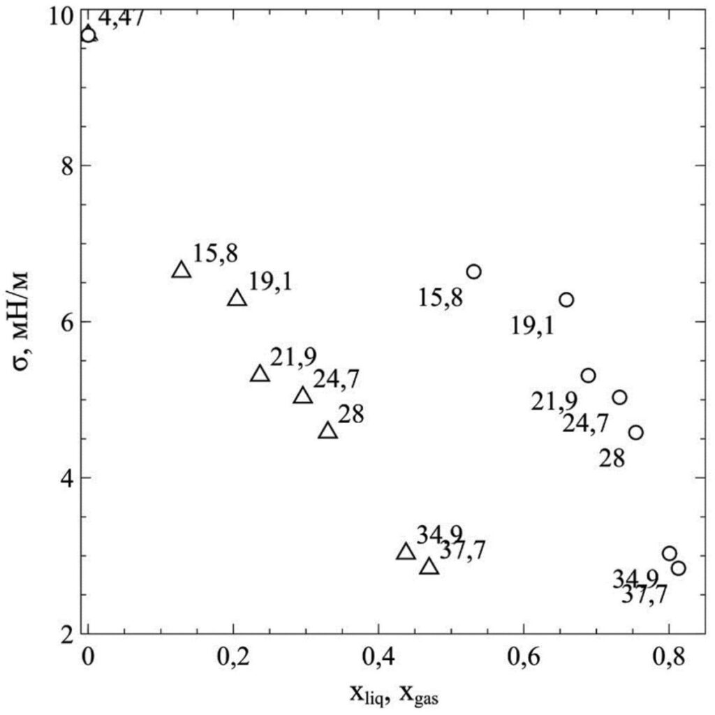 Рисунок 2. Зависимость поверхностного натяжения σ (мН/м) смеси метана и этана от доли метана в жидкой (треугольники) Xliq и газовой (круги) Xgas фазе при минус 60 °C. Цифрами показано давление соответствующей точки (атм). Источник: Russian Journal of Physical Chemistry A.