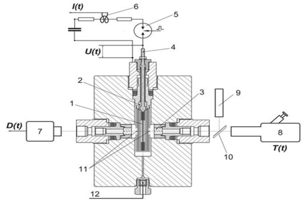 Рисунок 1. Экспериментальная установка для импульсного нагрева: 1 — образец никеля в камере высокого давления; 2 — керамический изолятор; 3 — сапфировое окно; 4 — электрический ввод; 5 — управляемый разрядник; 6 — трансформатор тока; 7 — стрик-камера; 8 — пирометр; 9 — лазер подсветки, 660 нм; 10 — дихроичное зеркало; 11 — защитные стекла; 12 — подача газа (He), 1—7000 бар. Источник: Journal of Applied Physics