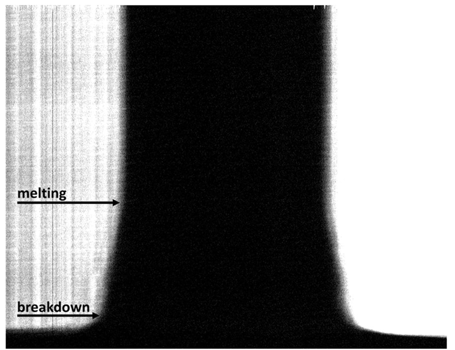 Рисунок 2. Изображение развертки поперечного расширения образца никеля в форме проволоки. Ось времени направлена сверху вниз. На изображении отчетливо видны моменты плавления и распада образца. Источник: Journal of Applied Physics