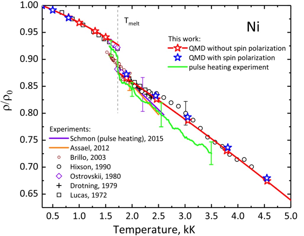 Рисунок 3. Зависимость относительной плотности от температуры при изобарном расширении никеля. Сплошная зеленая линия показывает измерения в эксперименте по импульсному нагреву, синие и красные звезды обозначают результаты КМД расчетов. Источник: Journal of Applied Physics