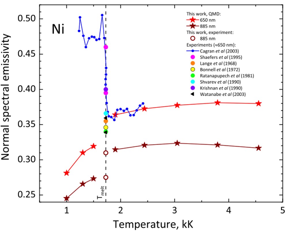 Рисунок 4. Зависимость нормальной спектральной излучательной способности никеля от температуры вдоль изобары. КМД расчеты представлены символами звезд, красные звезды соответствуют длине волны 650 нм, коричневые — 885 нм. Источник: Journal of Applied Physics