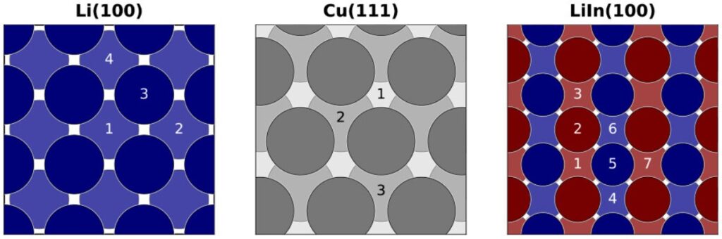 Рисунок 1. Адсорбционные центры на поверхности анодов: литиевого, медного и литий-индиевого (слева направо). Кругами изображены химические элементы: темно-синий — литий, серый — медь, темно-бордовый — индий. Цифрами показан путь диффузии атома лития. Источник: Journal of Applied Physics.