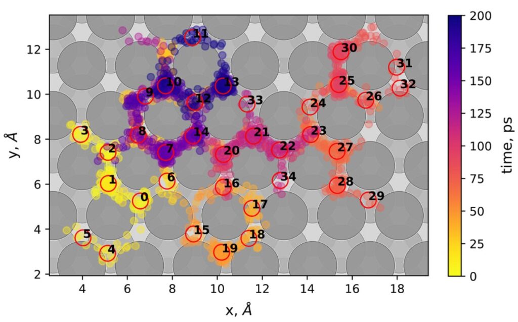 Рисунок 2. Траектория движения адсорбированного атома лития по поверхности медного анода при диффузии. Температура 353 ৹C. Красными окружностями обозначены посещенные адсорбционные центры на поверхности. Источник: Journal of Applied Physics.