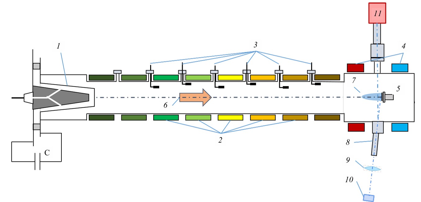 Рисунок 1. Схема эксперимента на установке МК-200: 1 — импульсный плазменный ускоритель; 2 — катушки магнитного поля; 3 — магнитные зонды; 4 — катушки Гельмгольца; 5 — мишень; 6 — плазменный поток; 7 — мишенная плазма; 8 — система патрубков; 9 — линза, 10 — пирометр; 11 — спектрометр. Источник: «Вопросы атомной науки и техники. Серия: Термоядерный синтез».