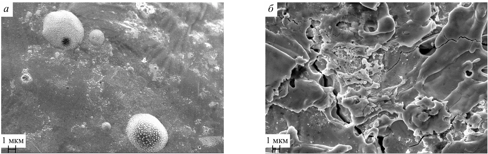 Рисунок 2. Поверхность висмута на вольфраме (а) и вольфрама без висмута (б) после воздействия водородным плазменным потоком. Источник: «Вопросы атомной науки и техники. Серия: Термоядерный синтез».