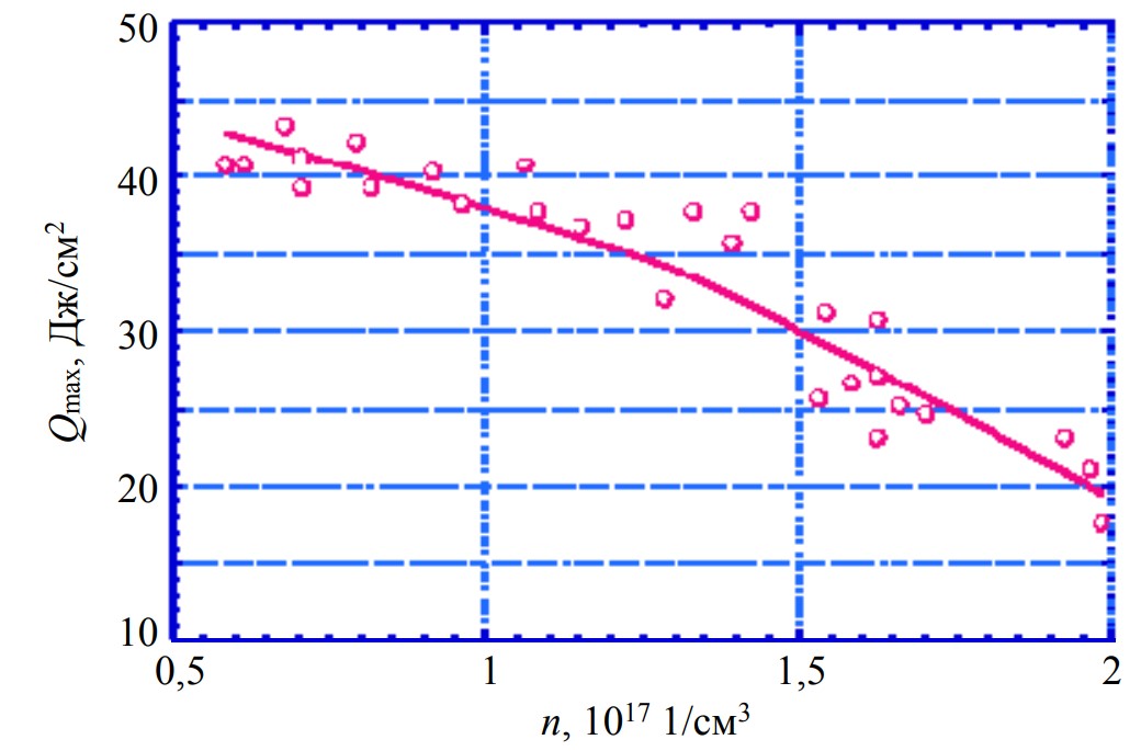 Рисунок 4. Зависимость максимальной плотности поглощенной мишенью энергии от плотности атомов в азотной газовой завесе. Источник: «Вопросы атомной науки и техники. Серия: Термоядерный синтез».
