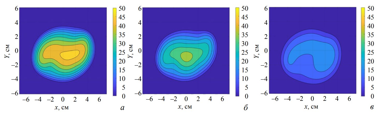 Рисунок 5. Влияние плотности газовой завесы на распределение тепла по поверхности мишени: а — без использования газовой завесы; б — азотная завеса с n ≈ 1,4·1017 см–3; в — азотная завеса с n ≈ 2·1017 см–3. Источник: «Вопросы атомной науки и техники. Серия: Термоядерный синтез».