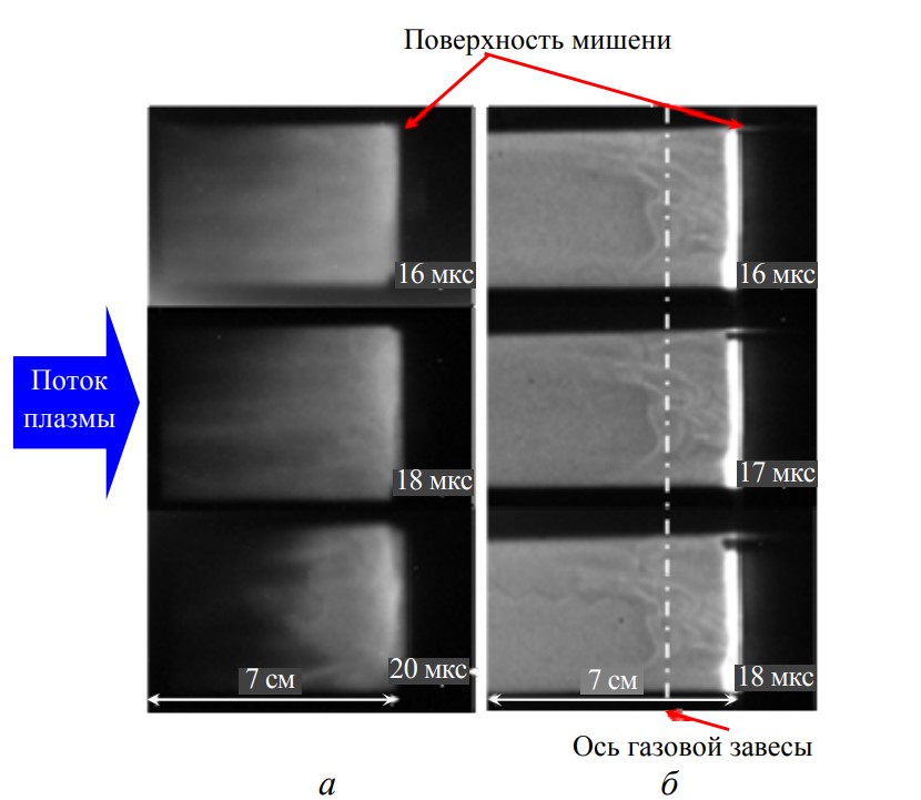 Эксперименты показали, что азотная газовая завеса с плотностью атомов 2⋅10¹⁷ см⁻³ существенно снижает тепловую нагрузку на вольфрамовую мишень. Поглощаемая мишенью энергия уменьшилась в 2–2,5 раза по сравнению с экспериментом с незащищенным вольфрамом. Ученые экспериментально определили зависимость поглощенной энергии от плотности частиц в завесе, продемонстрировав эффективность метода. Более того, газовая завеса эффективно ограничивает распространение паров вольфрама, предотвращая их взаимодействие с налетающим потоком плазмы и загрязнение плазмы тяжелыми примесями.