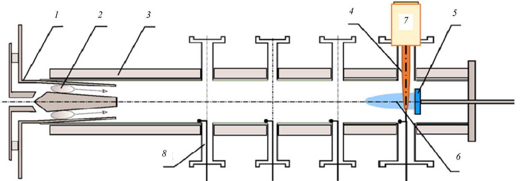 Рисунок 3. Схема экспериментов на установке МКТ: 1 — импульсный плазменный ускоритель; 2 — ускоряемая плазма; 3 — соленоиды; 4 — газовая завеса; 5 — вольфрамовая мишень; 6 — мишенная плазма; 7 — газовый клапан с формирователем струи; 8 — магнитные зонды. Источник: «Вопросы атомной науки и техники. Серия: Термоядерный синтез».