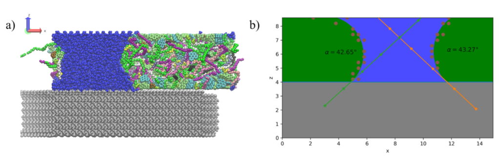 Рисунок 1. Снимок расчетной модели в системе кварц(серый)—вода(синий)—нефть(зеленый) для определения угла контакта. Источник: Colloids and Surfaces A: Physicochemical and Engineering Aspects