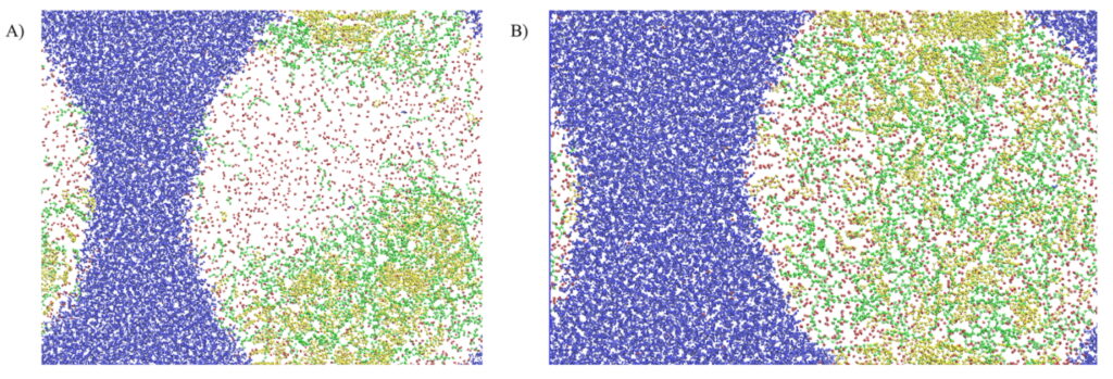 Рисунок 2. Снимок молекулярной конфигурации в системе кварц—нефть—вода с учетом ароматических соединений и метана. А) давление в системе 120 бар В) давление в системе 600 бар. Источник: Colloids and Surfaces A: Physicochemical and Engineering Aspects.