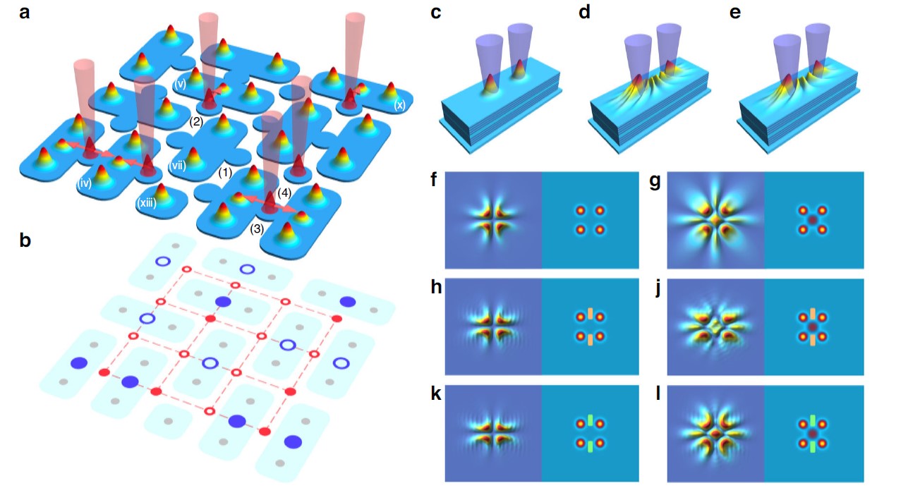 соответствовать нумерации на следующем рисунке 2 (пункт c). b) Иллюстрация предполагаемой структуры, с серыми, красными и синими кругами, обозначающими узлы решетки конденсата, входные и выходные оптические сигналы соответственно. Пустые (заполненные) круги соответствуют отсутствию (наличию) сигналов. (c–e) Иллюстрация возбуждения поляритонной диады в плоской микрорезонаторе, показывающая (c) профили двух нерезонансных пятен оптической накачки для возбуждения диады, (d, e) конденсаты в диаде с четным (OFF) и нечетным (ON) числом интерференционных полос. (f–l) Изображение возбуждения двух соседних диад в состояниях OFF (f, h, k) и ON (g, j, l). Каждая пара панелей показывает распределение плотности поляритонов (слева) и профили интенсивности накачки, включая потенциальный барьер (справа). Переключение между состояниями OFF и ON достигается с помощью сигнального оптического луча накачки, равноудаленного от четырех узлов. (f, g_ иллюстрируют отсутствие разделения между диадами, (h, j и k, l) показывают диады, разделенные реальным (оранжевый прямоугольник) и мнимым (зеленый прямоугольник) потенциальными барьерами соответственно. Источник: Light: Science & Applications.