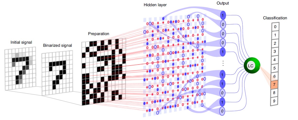 Рисунок 2. Концептуальная схема бинарной нейронной сети на основе решетки попарно связанных поляритонных конденсатов. Исходный сигнал формируется изображением в оттенках серого из набора данных MNIST, которое бинаризуется и проецируется на решетку, которая служит шаблоном для входного оптического сигнала. Затем этот сигнал активирует нейроны в скрытом слое, генерируя результирующий оптический выходной сигнал. Выход обрабатывается с помощью линейного классификатора. Источник: Light: Science & Applications.