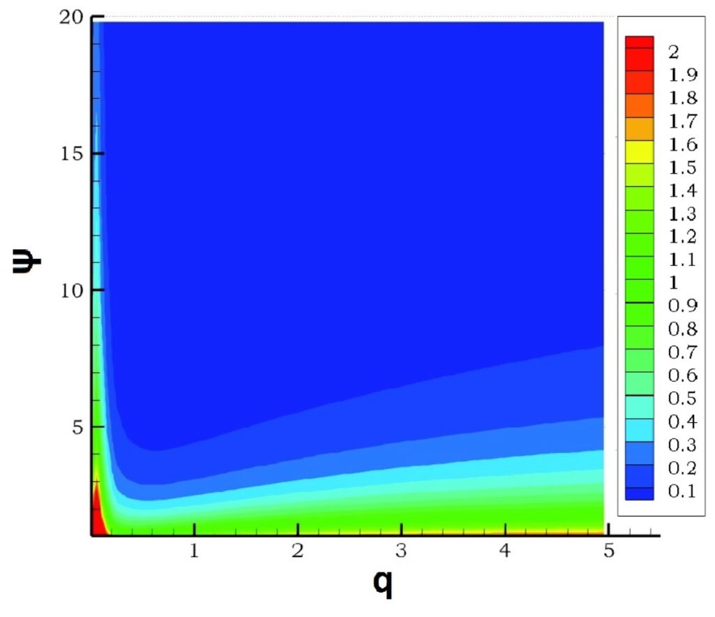 Рисунок 2. Распределение плотности потока массы в зависимости от параметров q и ψ. ψ определяется как отношение длины исследуемого тела к его полуширине. q показывает, заостренное тело или затупленное. Источник: журнал «Вестник Государственного университета просвещения. Серия: Физика—математика».