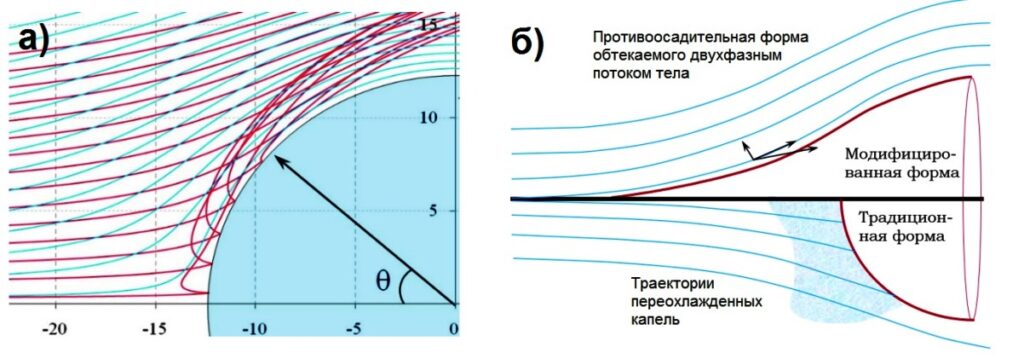 Рисунок 1. Особенности обтекания тела двухфазным потоком: а) различие траекторий движения капель воды (красный цвет) и потока газа (синий цвет), б) иллюстрация к расчету формы крыла, устойчивого к отложению налета. Источник: журнал «Вестник Государственного университета просвещения. Серия: Физика—математика».