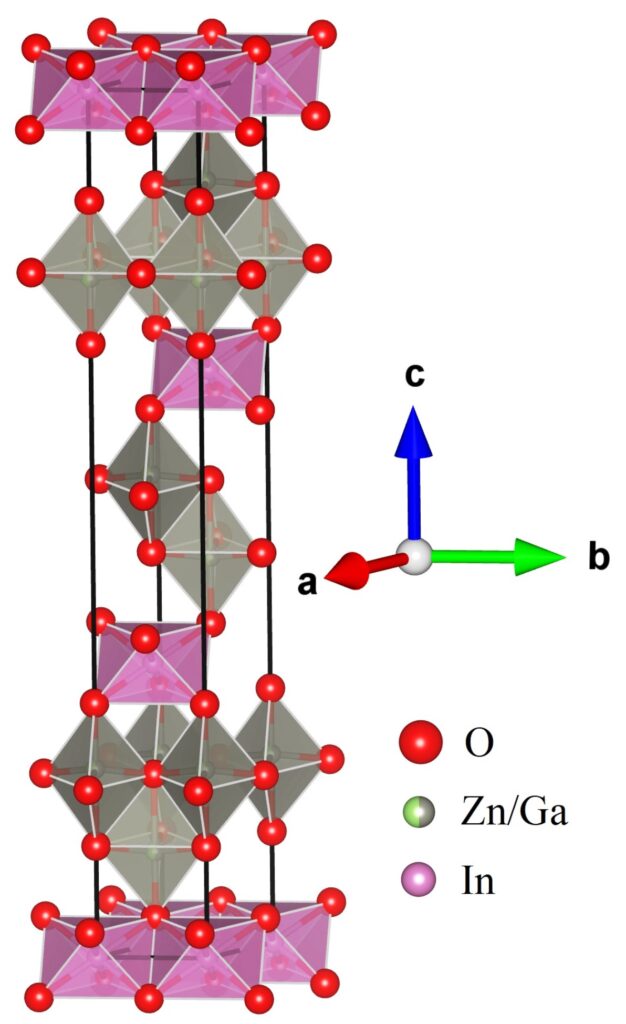 Рисунок 1. Структурная модель элементарной ячейки InGaZnO4, состоящей из октаэдров InO6 и тригональных бипирамид MO5, где M — это Zn или Ga. Источник: журнал Nanosystems: Physics, Chemistry, Mathematics.