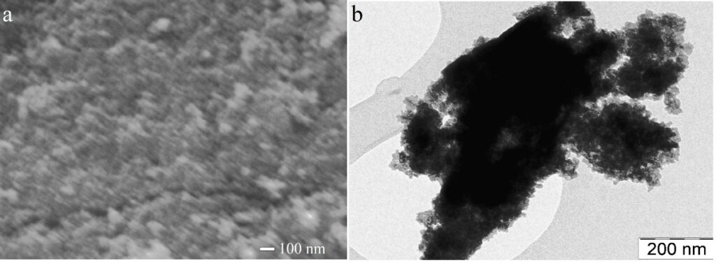 Рисунок 2. Изображения поверхности образца, полученные методом сканирующей (a) и просвечивающей (b) электронной микроскопии. Образец синтезирован с использованием глицерина, подвергался сушке при 500 °C в течение 6 часов. Источник: журнал Nanosystems: Physics, Chemistry, Mathematics.