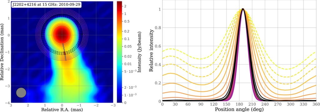 Слева: изображение BL Lac, полученное 29 сентября 2010 года на частоте 15 ГГц. Справа: угловой профиль интенсивности (I/Imax) на соответствующих расстояниях от видимого источника струи на изображении VLBI.