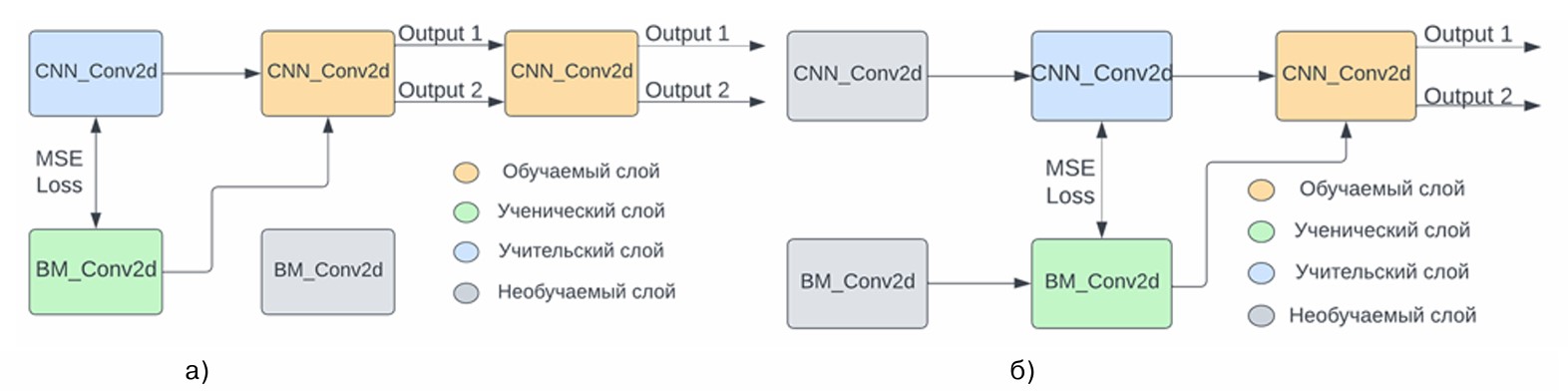 Рисунок 1. Принцип работы послойной дистилляции знания для БМ моделей для двух последовательно добавляемых слоев: а) для первого слоя, б) для второго слоя. Источник: Programming and Computer Software.