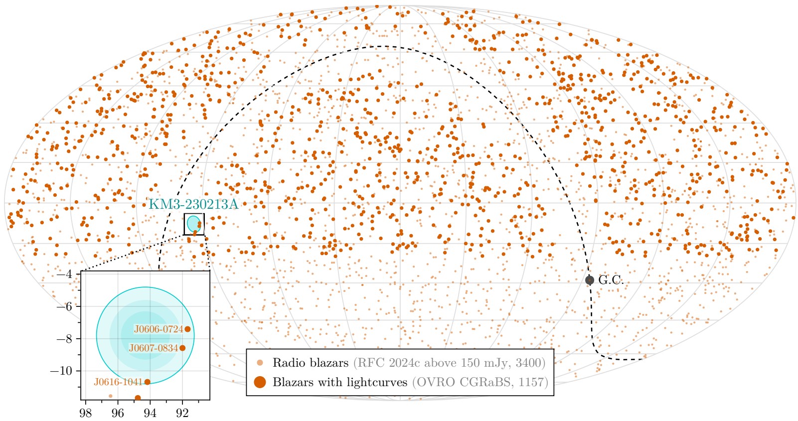 Блазары — это особая группа активных ядер галактик (AGN), в которых узкие, сильно релятивистские джеты направлены почти прямо в сторону Земли. Именно эти объекты способны излучать огромную энергию в широком спектральном диапазоне — от радио до гамма‑лучей, а изучение вспышечных процессов в их джетах может служить ключом к пониманию ускорения космических лучей. Цель исследования, поставленная коллективом KM3NeT, состояла в том, чтобы изучить характеристики детектированного нейтрино, а также провести поиск потенциальных источников, блазаров, чья активность могла бы быть связана с данным событием.