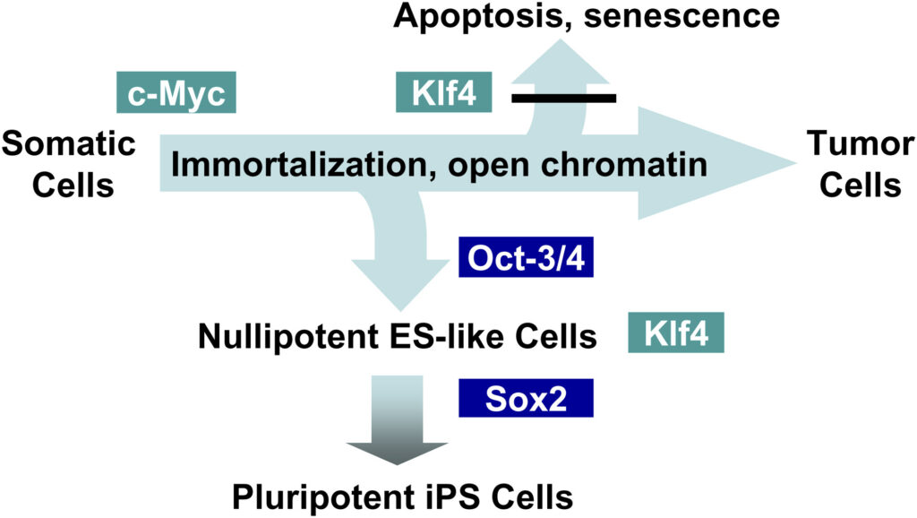 И даже если все гены одновременно оказались внутри ядра и заработали (что тоже не гарантировано, у клетки есть способы «заткнуть» чужеродную ДНК), и клетка начала производить факторы Яманаки, это еще не значит, что они справятся со своей задачей. Дело в том, что у каждого из этих белков есть и обычные функции. А значит, в клетке есть множество веществ, которые с этими белками должны взаимодействовать и мешать им работать слишком активно. Например, c-Myc участвует в делении клетки и, если будет заниматься этим слишком усердно, может превратить ее в опухолевую. Поэтому в клетке есть белки, которые блокируют работу c-Myc. Естественно, они будут препятствовать работе факторов Яманаки и мешать клетке стать стволовой.