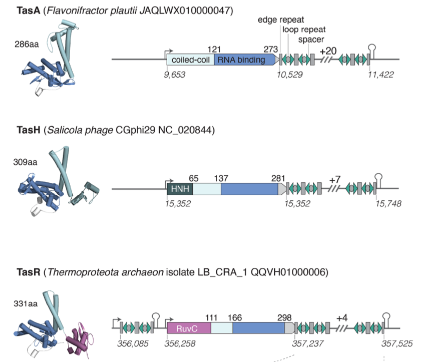 Массивы TIGR несут и информацию о эндонуклеазах Tas (TIGR-associated protein). Учёные нашли три разновидности Tas, отличающихся структурой. Белки отличаются своей способностью нести по два спейсера, а кроме того умением выгибать целевую ДНК под углом 180° в процессе редактирования.