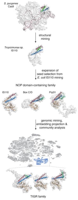 Поиск TIGR’a начался в базе данных белков, предсказанных алгоритмами машинного обучения AlphaFold. Исследователи искали при помощи программы DALI белки, в структуре которых есть фрагмент, форма которого как минимум наполовину схожа с формой RDB (RNA-binding domain, домен связывания с РНК) у Cas9 — то есть на ту часть, которой Cas9 белок прикрепляется ко своей направляющей РНК. Среди множества гомологов они нашли маленький белок транспозазу из транспозона IS110, RBD которой похож на RBD Cas9 (этот транспозон и геноредактор на его базе мы обсуждали в материале «В погоне за универсальным геноредактором»).