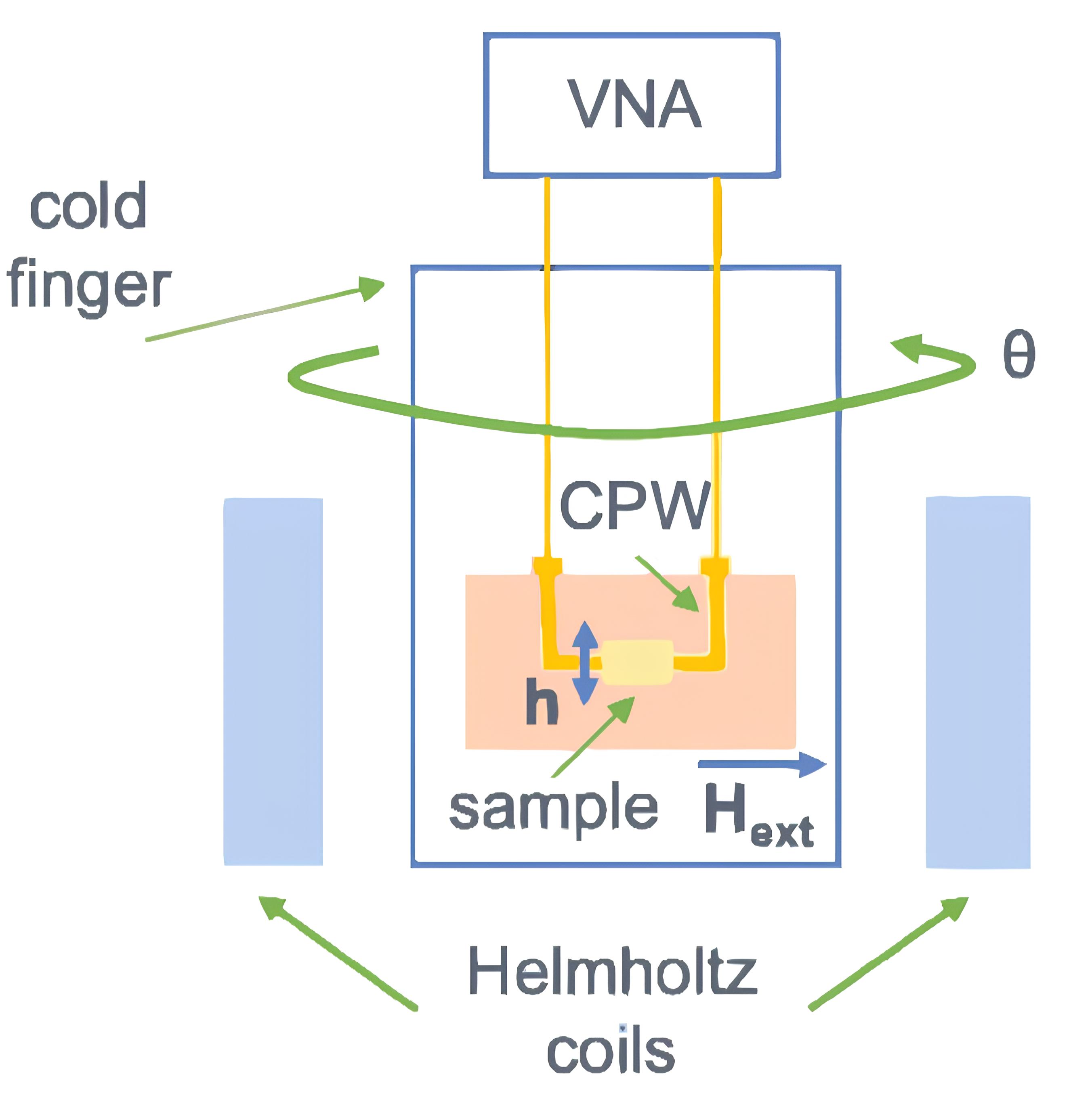 Рисунок 1. Схема измерения ферромагнитного резонанса. Образец помещается на копланарный волновод, прикрепленный к холодному пальцу гелиевого криостата замкнутого цикла Cryotrade CFSG-400-C. Прошедший сигнал, нормализованный по отклику от волновода, анализируется. Источник: Journal of Applied Physics.