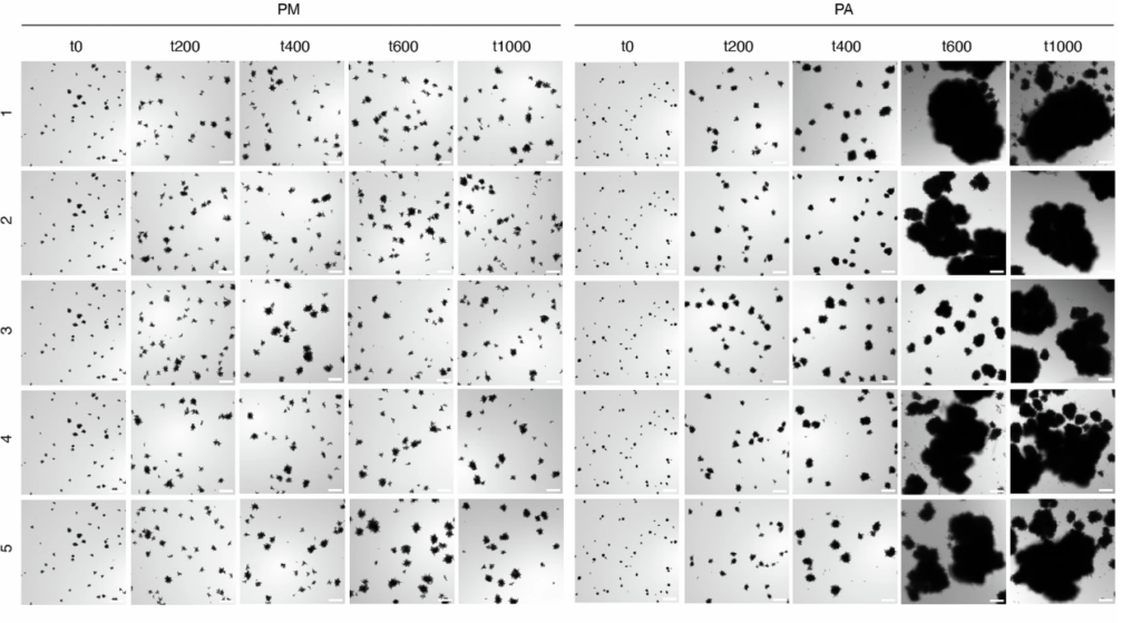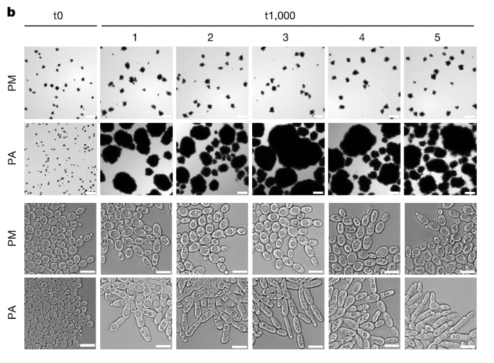 Оригинальные дрожжи (t0) и их потомки через 1000 дней (t1000), жившие в миксотрофных (PM) и анаэробных условиях (PA). Два верхних ряда — снимки кластеров (масштабная линейка = 200 мкм), нижние, соответственно, клеток (масштабная линейка = 10 мкм).