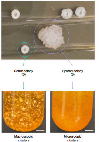 Авторы выделяют два типа колоний дрожжей по форме — колонии-пончики и расползающиеся колонии. Не смотря на то, что пончики меньше, именно они вырастают до самых больших кластеров, видных невооружённым глазом (внизу слева)