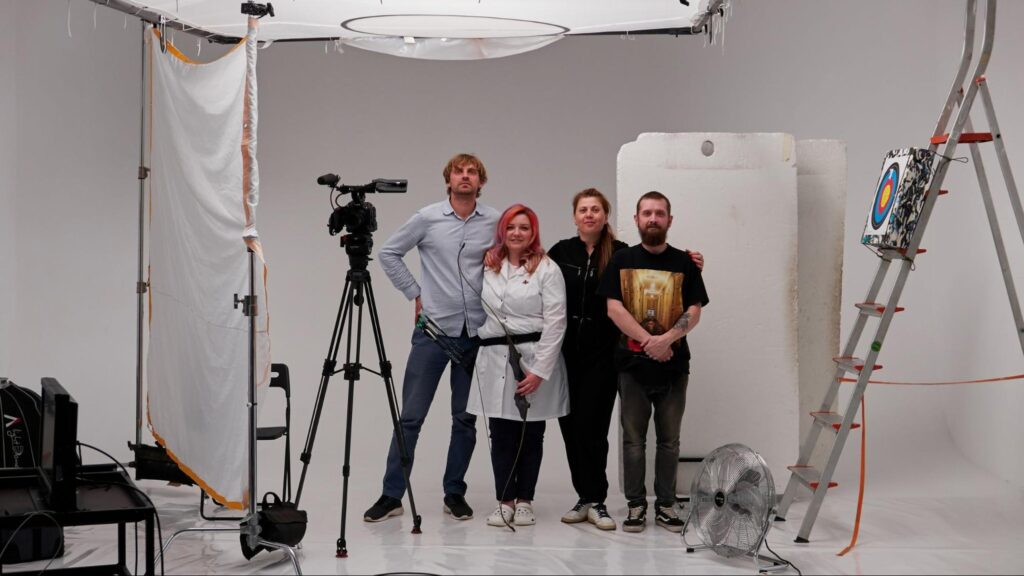 Всего съемочных дней было около 13–15, и проходили они не только в лаборатории. Много снимали у меня дома, в парке во время прогулок с собакой, в тире, где я стреляла из лука — есть у меня такое увлечение. В фильме даже есть аллегория: стрела, попадающая точно в цель, символизирует лекарство, которое нацелено на опухолевые клетки, — получилось очень красиво и символично, на мой взгляд. Хотя целый съемочный день в тире не вошел в итоговый монтаж, кадры с луком и стрелами все же появились в фильме — их сняли в белом футуристичном павильоне. Мы немало снимали на площади перед Новым корпусом МФТИ, где стоят памятники отцам-основателям Физтеха — я очень люблю этот монумент.