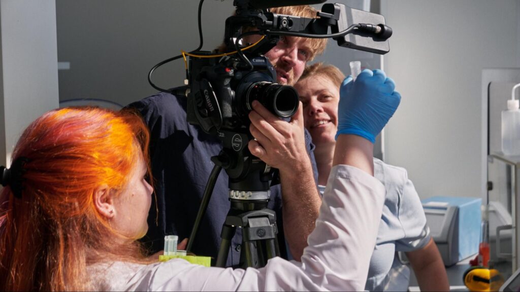 Съемочная команда — очень талантливые ребята. Ольга, безусловно, сделала очень много. Как она понимала, куда именно идти с камерой? Какие процессы снимать, где это стоит делать, а где вообще надо отстать от ребят и даже выйти из помещения? Если говорить о работе оператора, то до этого фильма, раньше, я про себя всегда думала — «но зато умная». А когда я посмотрела фильм, у меня немного поднялась самооценка, потому что Сергей так красиво снимает! Он очень красиво показал не только процессы, но и людей. Глядя на некоторых моих сотрудниц в кадре, я думала: «Елки-палки, да она же настоящая фотомодель, почему она вообще у меня в науке работает?»