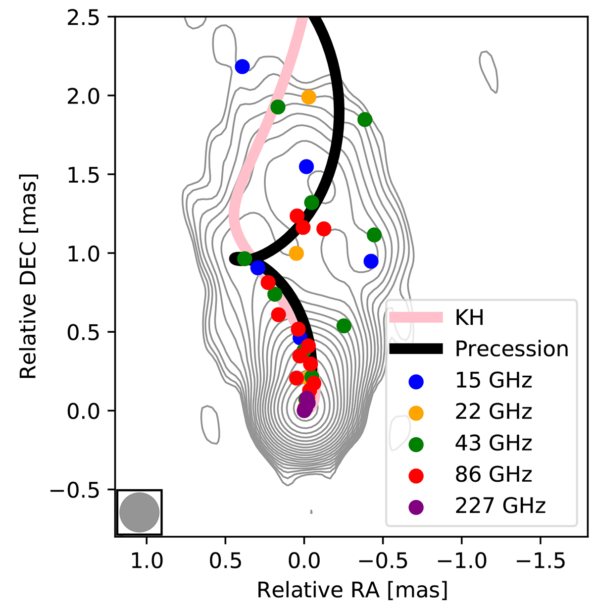 Рисунок 3. На рисунке контурами показано изображение квазара на частоте 43 ГГц с позициями компонентов джета, наложенными на модель прецессии (черная кривая) и модель нестабильности Кельвина—Гельмгольца (розовая кривая). Источник: журнал Astronomy and Astrophysics. Данные лучше описываются моделью прецессирующего джета. В чем причина прецессии, предстоит разобраться.