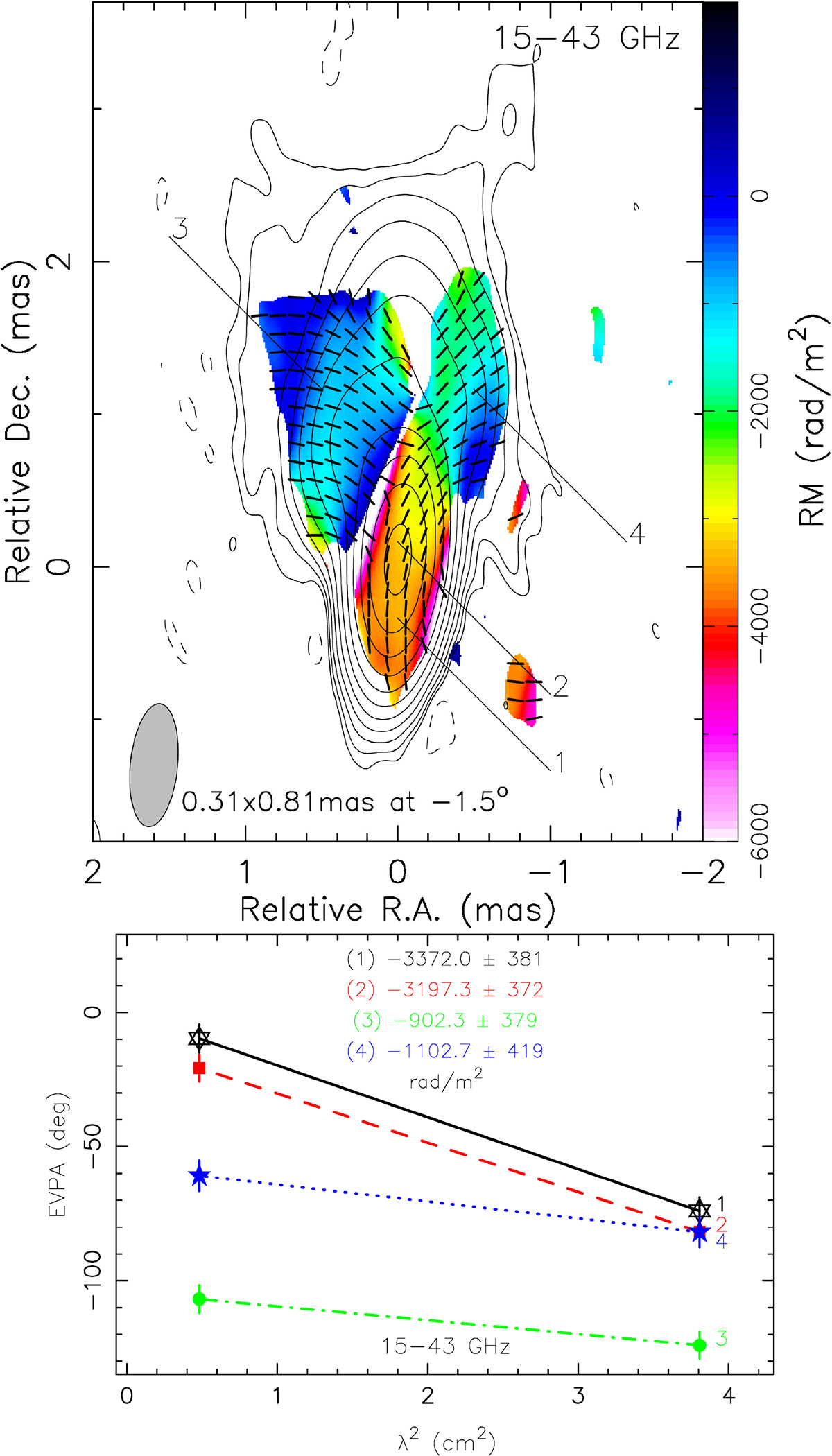 Рисунок 2. Здесь изображено, где в изучаемом объекте происходит Фарадеевское вращение (поворот поляризации радиоволн из-за магнитного поля в плазме), и насколько сильное это вращение. Верхняя панель показывает карту этого вращения, а нижняя панель показывает, как ученые определили величину вращения в конкретных точках.Измерения проводились на относительно низких частотах радиодиапазона. RM — это величина, которая показывает, насколько сильно поворачивается плоскость поляризации. Верхняя панель показывает карту — изображение, на котором разными цветами показана величина RM в разных точках объекта. Диапазон частот — от 15 до 43 ГГц. На карту RM наложены контуры, показывающие общую яркость радиоизлучения на частоте 43 ГГц. Эти контуры нарисованы с увеличивающейся яркостью (степенями двойки). На рисунке нарисованы маленькие палочки. Они показывают, в каком направлении колеблется электрическое поле радиоволн (это и есть поляризация). Важно, что эти палочки скорректированы на эффект Фарадеевского вращения. То есть показано истинное направление поляризации, которое было до того, как свет прошел через намагниченную плазму. На карте стоят числа. Эти числа указывают на конкретные места, где были сделаны расчеты, чтобы определить, насколько сильно вращается плоскость поляризации на разных длинах волн. EVPA — это функция, описывающая, как меняется угол поляризации в зависимости от квадрата длины волны. Источник: журнал Astronomy and Astrophysics.