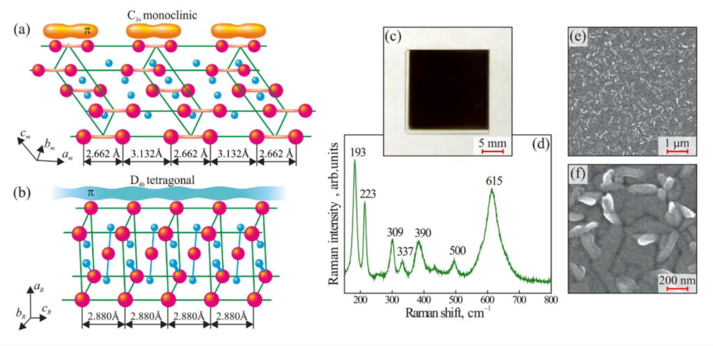 Рисунок. Образцы пленки VO2 толщиной 200 нм на сапфировой подложке толщиной 0,5 мм: (a), (b) схемы изолирующей моноклинной и проводящей тетрагональной структур VO2, наблюдаемых ниже и выше температуры перехода, соответственно; (c) фотография образца; (d) Рамановская спектроскопия образца, где заостренные пики соответствуют преобладающей моноклинной фазе VO2; (e), (f) сканирующая электронная микроскопия образца, подчеркивающая его поликристаллическую структуру. Источник: журнал Scientific Reports.