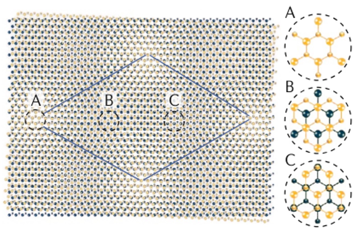Рисунок 1. Пример муаровой сверхрешетки на основе монослоев дихалькогенидов переходных металлов. Источник: Nature Reviews Physics.