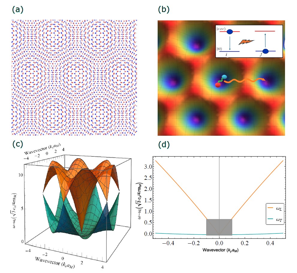 Рисунок 2. a) Схематическое изображение муарового узора, образованного в скрученном гетеробислое. Красные и синие точки показывают атомы переходного металла и халькогена соответственно. Угол закручивания θ = 5◦, несоответствие постоянных решетки не учитывается. (b) Цветной график модельного потенциала, испытываемого экситоном. Вставка показывает механизм распространения экситона между узлами i и j с помощью виртуальных процессов рекомбинации-генерации. (c) Дисперсия экситона. (d) Дисперсия экситона в окрестности Γ-точки. Источник: Physical Review B.