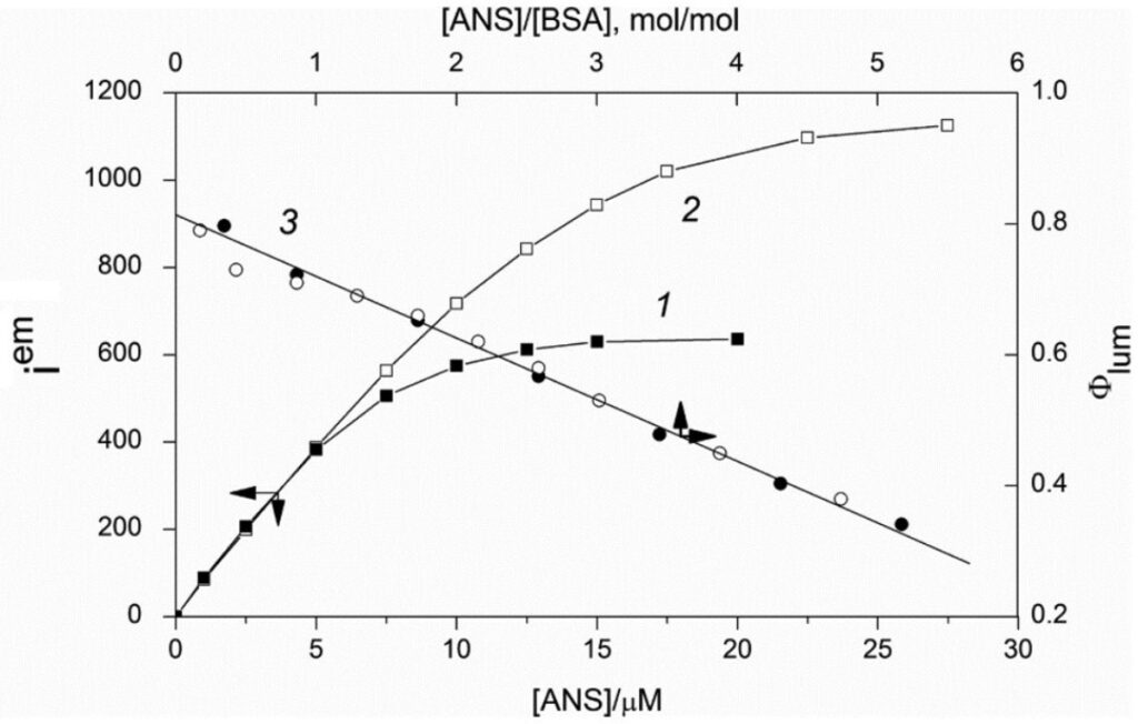 Рисунок 1. Зависимость интенсивности флуоресценции от концентрации 1,8-АНС (кривые 1 и 2) и квантового выхода флуоресценции от соотношения концентраций 1,8-АНС и БСА (кривая 3). Концентрация БСА составляет 2,9 µМ (закрашенные точки) и 5,8 µМ (светлые точки). Источник: Spectrochimica Acta Part A: Molecular and Biomolecular Spectroscopy.