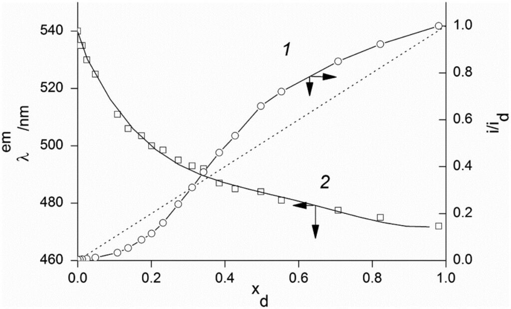 В смеси диметилсульфоксид — вода интенсивность флуоресценции 1,8-АНС изменяется интересным образом. При малых концентрациях воды ослабление флуоресценции меньше ожидаемого (Рисунок 2). С другой стороны, при малых концентрациях диметилсульфоксида уже не ослабление, а усиление флуоресценции 1,8-АНС значительно отстает от ожидаемого для случая аддитивного влияния компонентов смеси. Аддитивными называют величины, численное значение которых для всей системы может быть получено сложением значений, характеризующих отдельные ее части. Более того, для второго случая интенсивность флуоресценции пропорциональна квадрату мольной доли диметилсульфоксида.