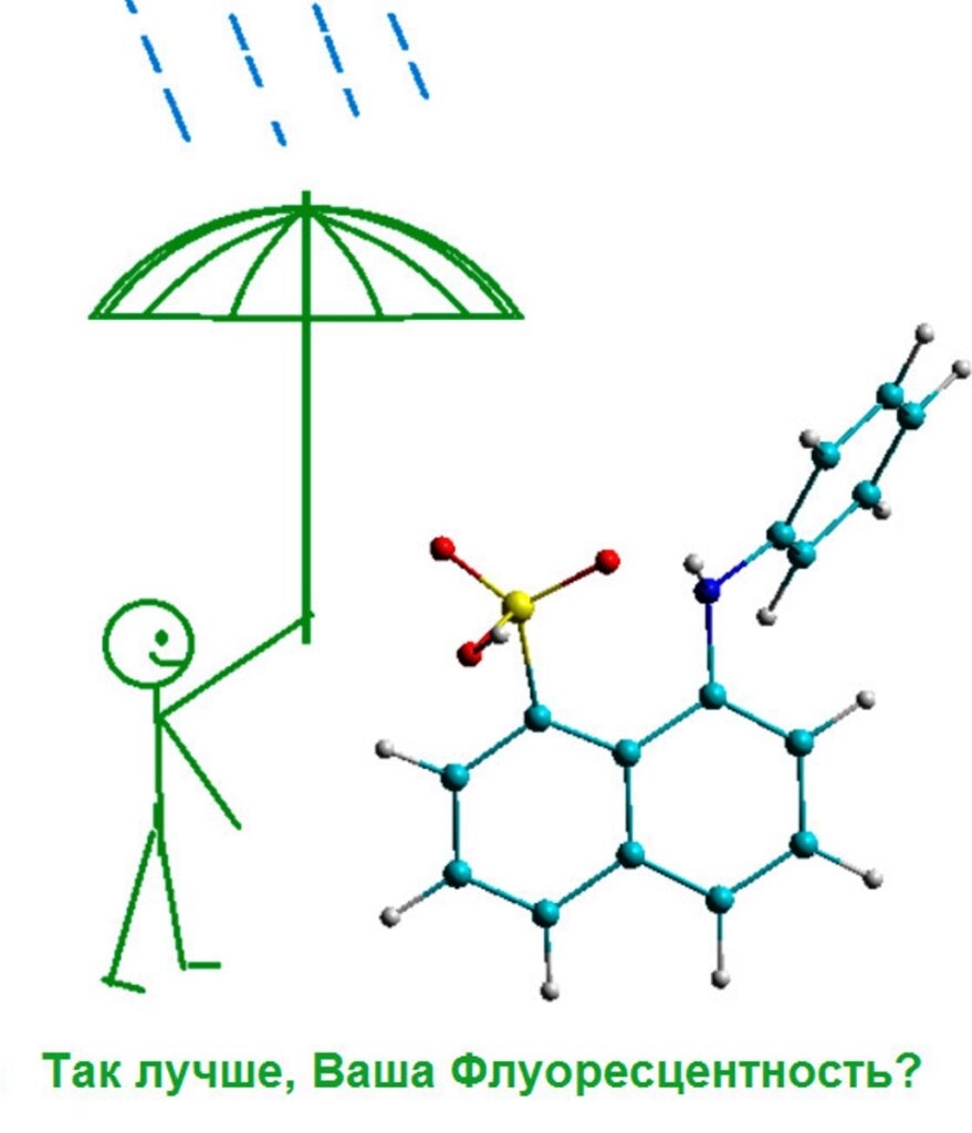 «Обнаруженное тушение флуоресценции 1-анилинонафталин-8-сульфоната молекулами воды побудило нас придать иронический характер графической аннотации к статье, где данное соединение показано под воображаемым зонтиком, — пояснил Алексей Трофимов. — На практике функцию зонтика выполняют усилители флуоресценции: как молекулы уже упомянутого диметилсульфоксида, так и другие, например, молекулы аммониевых соединений».