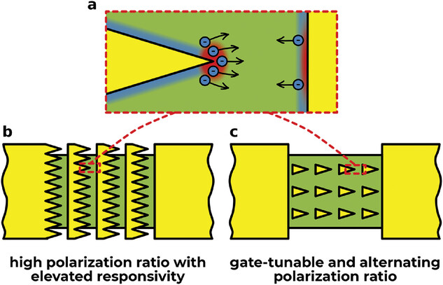 Рисунок 1. (a) Схематичное изображение принципа работы АСМП детекторов: усиление электрического поля с последующим нагревом электронов вблизи заострённых вершин АСМП приводит к возникновению термоэлектрического фототока — движения электронов от горячего края к холодному. (b), (c) Варианты метаповерхностей с различной функциональностью: АСМП типа «пила» (b) и АСМП типа «ковёр» (c). Первая обладает гигантским поляризационным контрастом, вторая способна определять угол поляризации излучения. Источник: Advanced Optical Materials.